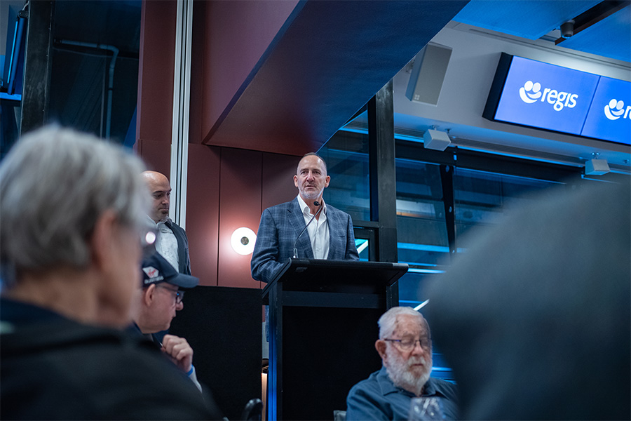 This year’s event followed on from last year’s hugely successful luncheon. The 2025 event brought new excitement, with guest speaker, former Melbourne footballer Rod Grinter, and a special appearance by Sally Freeman, Regis Board Member and Melbourne Football Club Director. Sally delighted residents by bringing along both the 2021 AFL and 2022 AFLW Premiership Cups, which quickly became the centrepiece for photos and plenty of proud smiles.