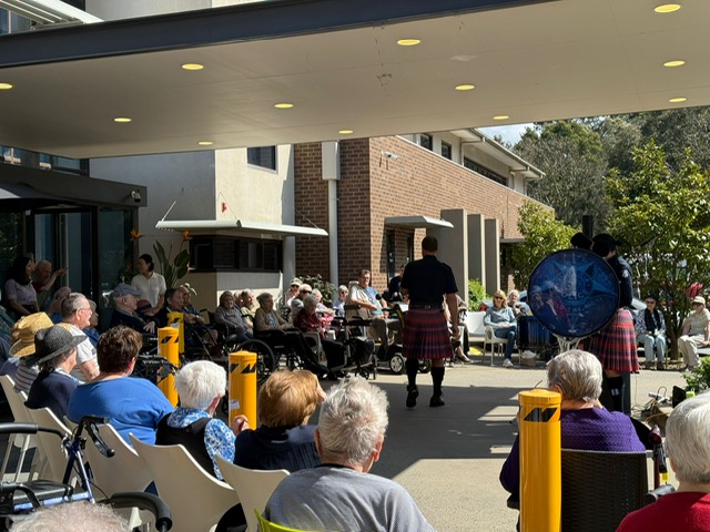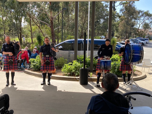 Anyone walking past Regis Blackburn a few Thursdays ago would have heard the melodic sound of bagpipes and drums wafting up the driveway. This is because the residents, family members and employees recently had a visit from the Victoria Police Pipe Band. Over 100 onlookers turned up to watch the show. The band played many familiar tunes, but in the different and unexpected form of pipe instruments. Everyone in the audience was delighted with the energetic and lively display.
